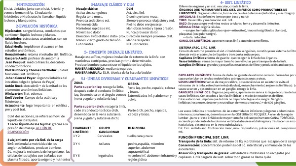 --Evacuación del líquido y productos de desecho del espacio intersticial, 2 procesos: captación de la prelinfa por los capilares linfáticos y evacuación de la linfa por el interior de los vasos. -- Acciones mecánicas del DLM: presión, estiramiento cutáneo. -- Diferencias masaje clásico: dirección, presión, ritmo, y No lubricantes. --Efectos del DLM: drenaje, neurológico, inmunológico y musc. -- DLM indicado en personas sanas, favorece el equilibrio y trofismo de tejidos corporales. Y en personas con alguna patología... -- DLM contraindicado en caso de infección aguda y presencia de tumores malignos, trombosis, flebitis....