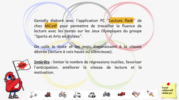 Genially élaboré avec l'application PC "Lecture flash" de chez MiCetF pour permettre de travailler la fluence de lecture avec les textes sur les Jeux Olympiques du groupe "Sports et Arts en dictées". On colle le texte et les mots disparaissent à la vitesse désirée (lecture à voix haute ou silencieuse). Intérêts : limiter le nombre de régressions inutiles, favoriser l'anticipation, améliorer la vitesse de lecture et la motivation.