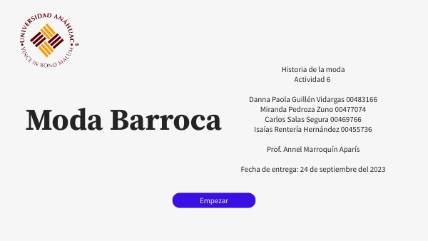 Historia de la moda Actividad 6 Danna Paola Guillén Vidargas 00483166 Miranda Pedroza Zuno 00477074 Carlos Salas Segura 00469766 Isaías Rentería Hernández 00455736 Prof. Annel Marroquín Aparís Fecha de entrega: 24 de septiembre del 2023