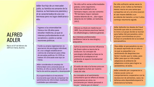 Para Adler el psicoanalisis no era lo sexual reprimido de un niño si no que su pequeñez y su sentimiento de desproteccion fente l mundo que lo rodea, para Adler para que un niño pueda adaptarse al ambiente de adaptarse a otros para lograr su autoestima y el exito.