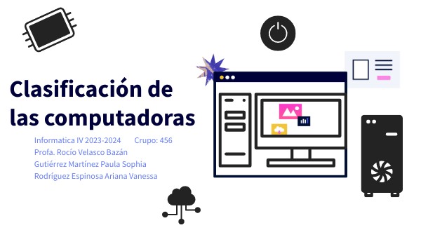 Una computadora es, un dispositivo electrónico capaz de recibir un conjunto de instrucciones y ejecutarlas realizando cálculos sobre los datos numéricos, o bien compilando y correlacionando otros tipos de información. Y se clasifican de las siguientes formas. 1. Por su tamaño . Microcomputadoras . Minicomputadoras . Macrocomputadoras . Supercomputadoras 2. Por la forma en la que procesan los datos . Analógicas . Cuánticas . Híbridas