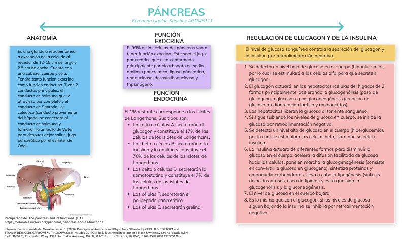 Es una glándula retroperitoneal a excepción de la cola, de al rededor de 12-15 cm de largo y 2.5 cm de ancho. Cuenta con una cabeza, cuerpo y cola. Tendra tanto funcion exocrina como funcion endocrina. Tiene 2 conductos principales, el conducto de Wirsung que lo atraviesa por completo y el conducto de Santorini, el coledoco (conducto proveniente del hígado) se conectara al conducto de Wirsung y formaran la ampolla de Vater, para despues dejar salir el jugo pancreático por el esfínter de Oddi.