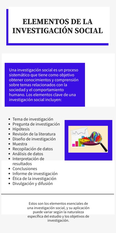 Una investigación social es un proceso sistemático que tiene como objetivo obtener conocimientos y comprensión sobre temas relacionados con la sociedad y el comportamiento humano. Los elementos clave de una investigación social incluyen: