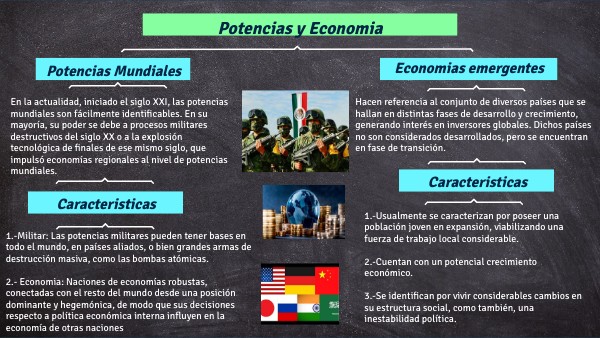 1.-Militar: Las potencias militares pueden tener bases en todo el mundo, en países aliados, o bien grandes armas de destrucción masiva, como las bombas atómicas. 2.- Economia: Naciones de economías robustas, conectadas con el resto del mundo desde una posición dominante y hegemónica, de modo que sus decisiones respecto a política económica interna influyen en la economía de otras naciones