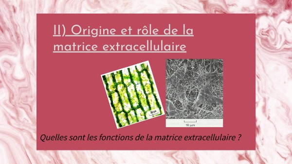 La matrice extracellulaire est l'ensemble des molécules qui entourent une cellule et qui offre des fonctions différentes (exemple vu en cours : collagène , cellulose , élastine ...). C'est un réseau de molécules sécrétées par les cellules des organismes pluricellulaires. Elle fourni un support aux cellules proches mais elle peut aussi remplir des fonctions de communications et de protections (mécanique et chimique).