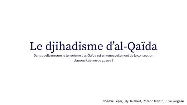 Pour conclure, le terrorisme d'Al-Qaïda est un renouvellement de la conception clausewitzienne de guerre. Cependant, la notion même de terrorisme est difficile à manier. En effet, le terrorisme d'Al-Qaïda peut prendre plusieurs formes comme nous pouvons le voir dans les documents précédemment étudiés. Ce dernier peut être compris comme une stratégie de "guerre absolue" car le but est d'anéantir l'Occident en impliquant l'ensemble des musulmans du monde, notamment avec de nombreux attentats comme celui du 11 septembre 2001. De plus, le terrorisme d'Al-Qaïda peut également être compris comme une stratégie de "petite guerre" avec des actions ponctuelles, menées par des civils ayant des moyens très limités. Al-Qaïda attaque généralement l'Occident, qui est un ennemi trop lointain mais également plus puissant. Nous pouvons donc également qualifier le terrorisme d'Al-Qaïda de "guerre irrégulière" étant donné que la violence n'est pas réciproque, que les terroristes ne se battent pas directement contre des armées étatiques et qu'il n'y a pas de combattants officiels. En conclusion, il est très difficile de ne donner qu'une seule conception clausewitzienne au terrorisme, car celui-ci peut prendre différentes formes et ne cesse de se "moderniser". Nous pouvons donc donner les conceptions les plus communes que sont : la "guerre absolue", ", la "petite guerre" ou encore la "guerre irrégulière".
