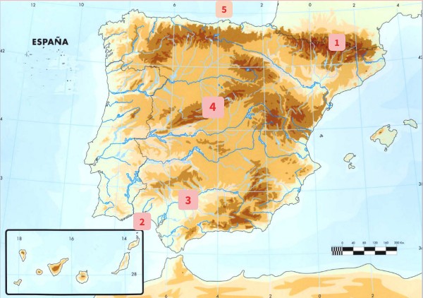 MAPA FÍSIC D’ESPANYA 1) PIRINEUS 2) BADIA DE CADIS 3) GUADALQUIVIR 4) SISTEMA IBÈRIC 5) CAP D'AJO 6) SERRA DE TRAMUNTANA 7) DEPRESSIÓ DE L'EBRE 8) MUNTANYES DE LLEÓ 9) LANZAROTE 10) SUBMESETA SUD