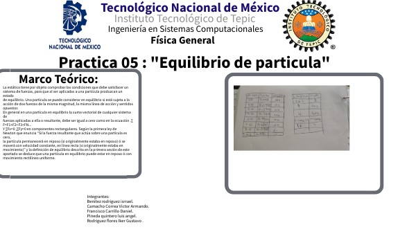 La estática tiene por objeto comprobar las condiciones que debe satisfacer un sistema de fuerzas, para que al ser aplicadas a una partícula produzcan un estado de equilibrio. Una partícula se puede considerar en equilibrio si está sujeta a la acción de dos fuerzas de la misma magnitud, la misma línea de acción y sentidos opuestos En general en una partícula en equilibrio la suma vectorial de cualquier sistema de fuerzas aplicadas a ella o resultante, debe ser igual a cero como en la ecuación .∑ F=F1+F2+F3+FN... Y ∑Fx=0 ,∑Fy=0 en componentes rectangulares. Según la primera ley de Newton que enuncia “Si la fuerza resultante que actúa sobre una partícula es cero, la partícula permanecerá en reposo (si originalmente estaba en reposo) ó se moverá con velocidad constante, en línea recta (si originalmente estaba en movimiento)” y la definición de equilibrio descrita en la primera sesión de este apartado se deduce que una partícula en equilibrio puede estar en reposo ó con movimiento rectilíneo uniforme.