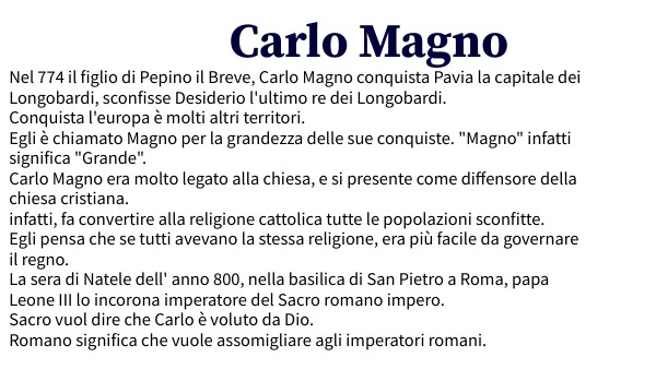 Nel 774 il figlio di Pepino il Breve, Carlo Magno conquista Pavia la capitale dei Longobardi, sconfisse Desiderio l'ultimo re dei Longobardi. Conquista l'europa è molti altri territori. Egli è chiamato Magno per la grandezza delle sue conquiste. "Magno" infatti significa "Grande". Carlo Magno era molto legato alla chiesa, e si presente come diffensore della chiesa cristiana. infatti, fa convertire alla religione cattolica tutte le popolazioni sconfitte. Egli pensa che se tutti avevano la stessa religione, era più facile da governare il regno. La sera di Natele dell' anno 800, nella basilica di San Pietro a Roma, papa Leone III lo incorona imperatore del Sacro romano impero. Sacro vuol dire che Carlo è voluto da Dio. Romano significa che vuole assomigliare agli imperatori romani.