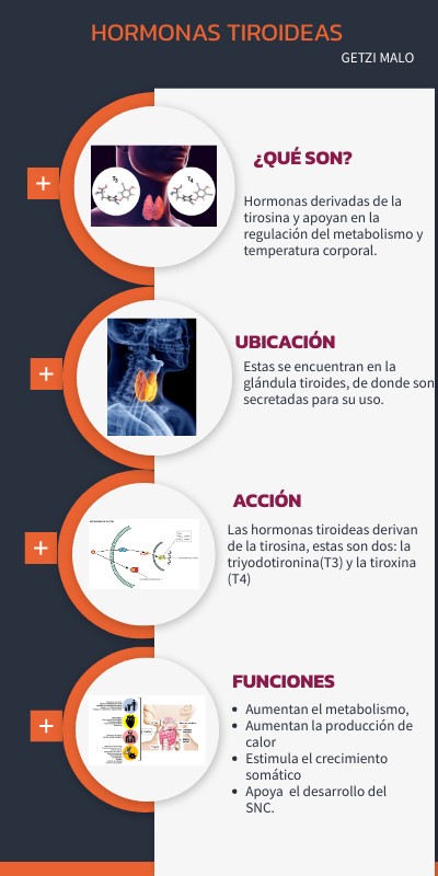 Hormonas derivadas de la tirosina y apoyan en la regulación del metabolismo y temperatura corporal.