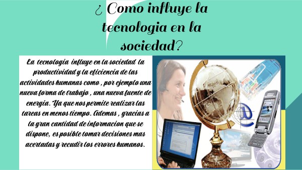 La tecnologia influye en la sociedad la productividad y la eficiencia de las actividades humanas como , por ejemplo una nueva forma de trabajo , una nueva fuente de energia. Ya que nos permite realizar las tareas en menos tiempo. Ademas , gracias a la gran cantidad de informacion que se dispone, es posible tomar decisiones mas acertadas y recudir los errores humanos.