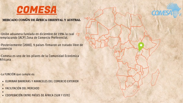 -Unión aduanera fundada en diciembre de 1994 la cual remplazando (ACP) Zona de Comercio Preferencial. -Posteriormente (2000), 9 países firmaron un tratado libre de comercio -Comesa es uno de los pilares de la Comunidad Económica Africana