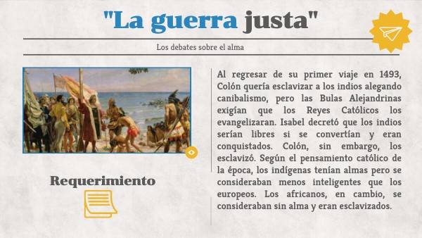 Al regresar de su primer viaje en 1493, Colón quería esclavizar a los indios alegando canibalismo, pero las Bulas Alejandrinas exigían que los Reyes Católicos los evangelizaran. Isabel decretó que los indios serían libres si se convertían y eran conquistados. Colón, sin embargo, los esclavizó. Según el pensamiento católico de la época, los indígenas tenían almas pero se consideraban menos inteligentes que los europeos. Los africanos, en cambio, se consideraban sin alma y eran esclavizados.