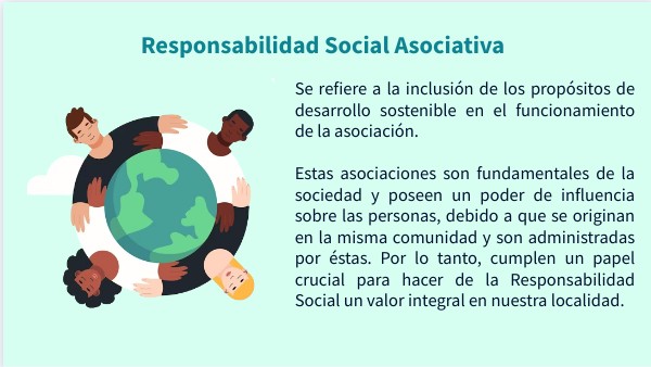 Se refiere a la inclusión de los propósitos de desarrollo sostenible en el funcionamiento de la asociación. Estas asociaciones son fundamentales de la sociedad y poseen un poder de influencia sobre las personas, debido a que se originan en la misma comunidad y son administradas por éstas. Por lo tanto, cumplen un papel crucial para hacer de la Responsabilidad Social un valor integral en nuestra localidad.