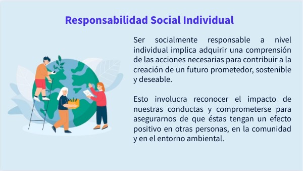 Ser socialmente responsable a nivel individual implica adquirir una comprensión de las acciones necesarias para contribuir a la creación de un futuro prometedor, sostenible y deseable. Esto involucra reconocer el impacto de nuestras conductas y comprometerse para asegurarnos de que éstas tengan un efecto positivo en otras personas, en la comunidad y en el entorno ambiental.