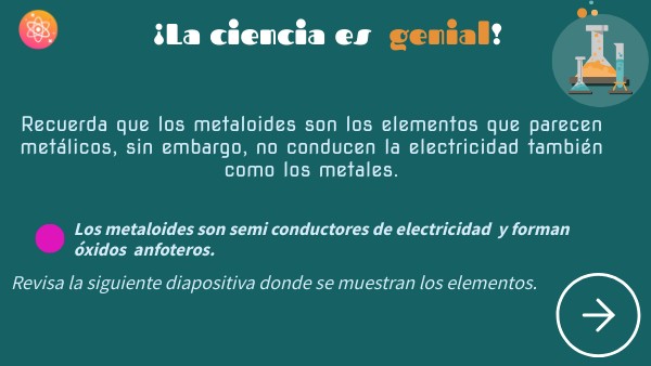 Recuerda que los metaloides son los elementos que parecen metálicos, sin embargo, no conducen la electricidad también como los metales.