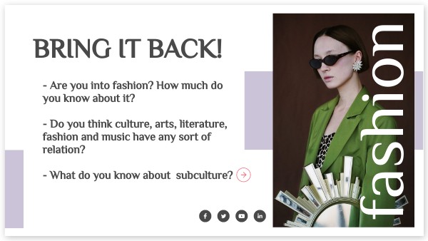 - Are you into fashion? How much do you know about it? - Do you think culture, arts, literature, fashion and music have any sort of relation? - What do you know about subculture?