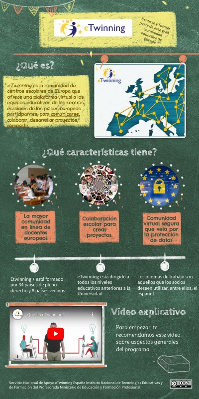 eTwinning es la comunidad de centros escolares de Europa que ofrece una plataforma virtual a los equipos educativos de los centros escolares de los países europeos participantes, para comunicarse, colaborar, desarrollar proyectos, compartir.