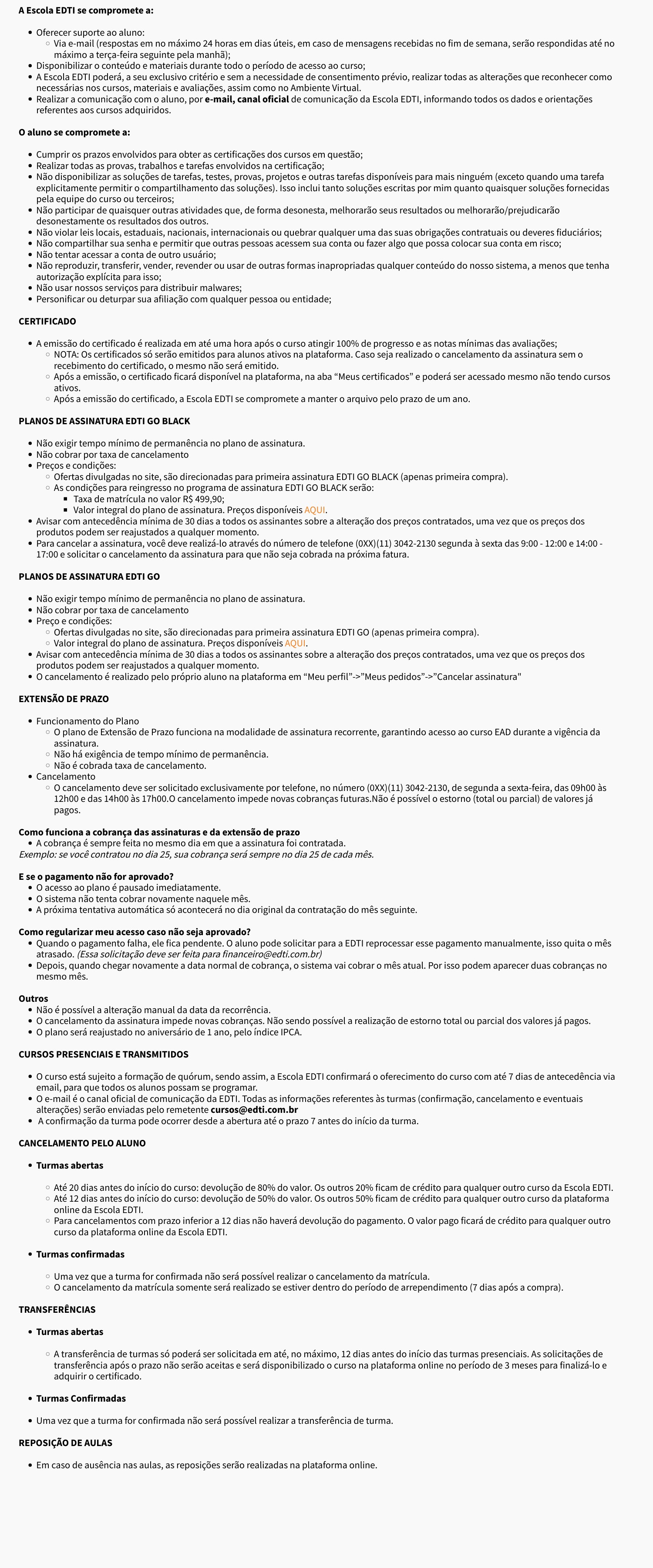 - A Escola EDTI poderá, a seu exclusivo critério e sem a necessidade de consentimento prévio, realizar todas as alterações que reconhecer como necessárias nos cursos, materiais e avaliações, assim como no Ambiente Virtual.