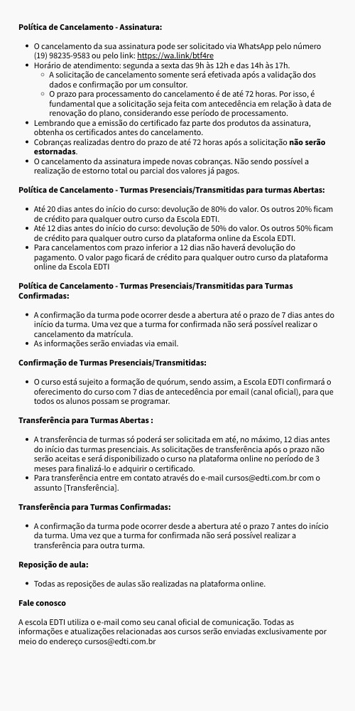 Política de Cancelamento - Turmas Presenciais/Transmitidas para turmas Abertas:- Até 20 dias antes do início do curso: devolução de 80% do valor. Os outros 20% ficam de crédito para qualquer outro curso da Escola EDTI.