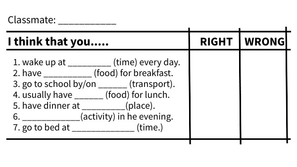 1. wake up at _________ (time) every day. 2. have __________ (food) for breakfast. 3. go to school by/on ______ (transport). 4. usually have ______ (food) for lunch. 5. have dinner at _________(place). 6. ____________(activity) in he evening. 7. go to bed at _____________ (time.)