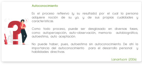 Autoconocimiento Es el proceso reflexivo (y su resultado) por el cual la persona adquiere noción de su yo, y de sus propias cualidades y características. Como todo proceso, puede ser desglosado en diversas fases, como: autopercepción, auto-observación, memoria autobiográfica, autoestima, auto aceptación. No puede haber, pues, autoestima sin autoconocimiento. De ahí la importancia del autoconocimiento para el desarrollo personal y habilidades directivas. Lanantuoni (2006)