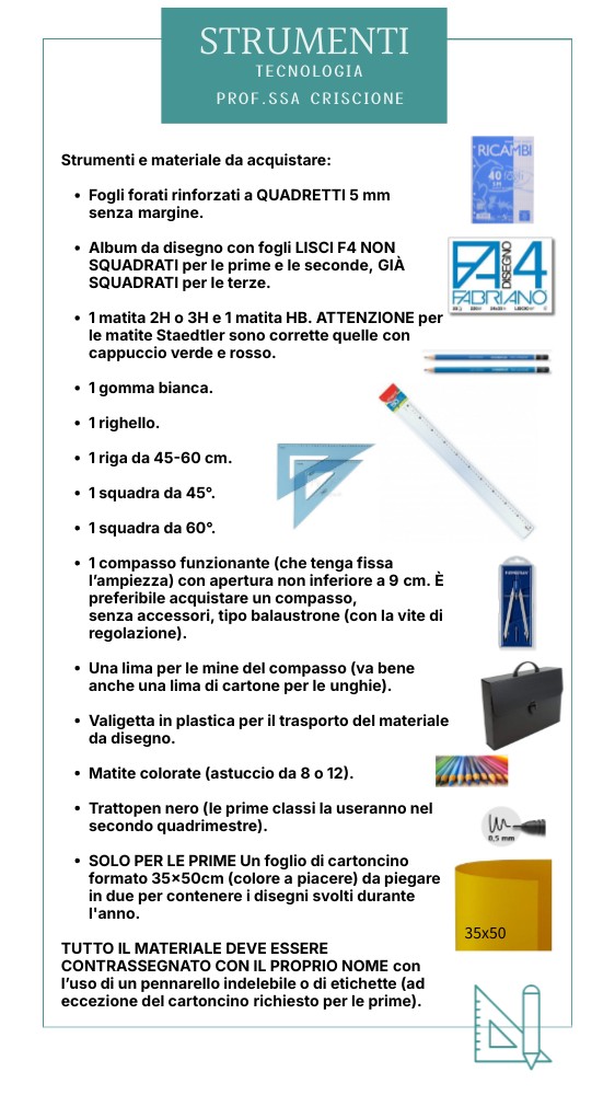 TUTTO IL MATERIALE DEVE ESSERE CONTRASSEGNATO CON IL PROPRIO NOME con l’uso di un pennarello indelebile o di etichette (ad eccezione del cartoncino richiesto per le prime).35x50