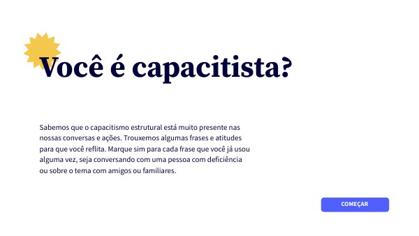Sabemos que o capacitismo estrutural está muito presente nas nossas conversas e ações. Trouxemos algumas frases e atitudes para que você reflita. Marque sim para cada frase que você já usou alguma vez, seja conversando com uma pessoa com deficiência ou sobre o tema com amigos ou familiares.