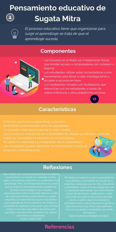 Mitra, S. (2014). El futuro de la educación escolar. Los niños y el aprendizaje al borde del caos. Prospects, 44, 547-558. http://soleargentina.org/contenido/wp-content/uploads/2016/05/El_futuro_de_la_educaci%C3%B3n_escolar._Los_ni%C3%B1os_y_el_aprendizaje_al_borde_del_caos._Mitra.pdf TED (27 de febrero de 2013). Sugata Mitra: Construyendo una escuela en la nube. [Archivo de video]. https://www.youtube.com/watch?v=y3jYVe1RGaU
