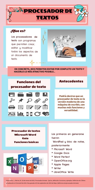 Pérez Porto, J., Merino, M. (10 de marzo de 2010). Procesador de texto - Qué es, definición, funciones y ejemplos. Definicion.de. Última actualización el 23 de abril de 2021. Recuperado el 25 de septiembre de 2023 de https://definicion.de/procesador-de-texto/