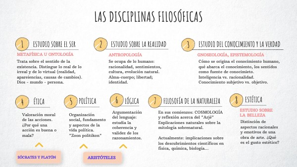 En sus comienzos: COSMOLOGÍAy reflexión acerca del "Arjé" Explicaciones naturales sobre la mitología sobrenatural. Actualmente: implicaciones sobre los descubrimientos científicos en física, química, biología...