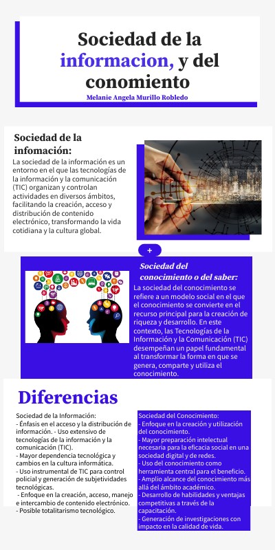 Sociedad del Conocimiento: - Enfoque en la creación y utilización del conocimiento. - Mayor preparación intelectual necesaria para la eficacia social en una sociedad digital y de redes. - Uso del conocimiento como herramienta central para el beneficio. - Amplio alcance del conocimiento más allá del ámbito académico. - Desarrollo de habilidades y ventajas competitivas a través de la capacitación. - Generación de investigaciones con impacto en la calidad de vida.