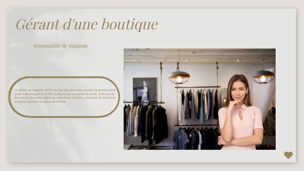 Le gérant de magasin anime les équipes de vente, encadre le personnel et veille à développer le chiffre d'affaires de son point de vente. Il décide de la mise en place des objets ou collections à vendre, ainsi que du choix des produits à mettre en valeur en vitrine.