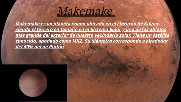 Makemake es un planeta enano ubicado en el cinturón de Kuiper, siendo el tercero en tamaño en el Sistema Solar y uno de los objetos más grande del exterior de nuestro vecindario solar. Tiene un satélite conocido, apodado como MK2. Su diámetro corresponde a alrededor del 60% del de Plutón