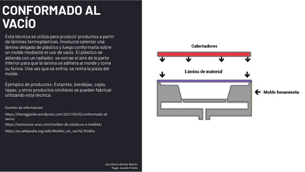Esta técnica se utiliza para producir productos a partir de láminas termoplásticas. Involucra calentar una lámina delgada de plástico y luego conformarla sobre un molde mediante el uso de vacío. El plástico se ablanda con un radiador, se extrae el aire de la parte inferior para que la lámina se adhiera al molde y tome su forma. Una vez que se enfría, se retira la pieza del molde. Ejemplos de productos: Estantes, bandejas, cajas, tapas, y otros productos similares se pueden fabricar utilizando esta técnica.
