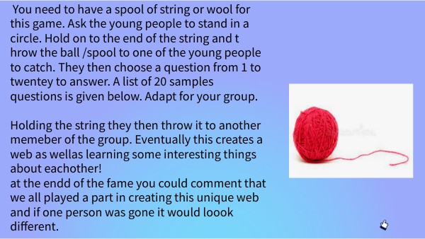 You need to have a spool of string or wool for this game. Ask the young people to stand in a circle. Hold on to the end of the string and throw the ball /spool to one of the young people to catch. They then choose a question from 1 to twentey to answer. A list of 20 samples questions is given below. Adapt for your group. Holding the string they then throw it to another memeber of the group. Eventually this creates a web as well as learning some interesting things about eachother! At the endd of the game you could comment that we all played a part in creating this unique web and if one person was gone it would look different.