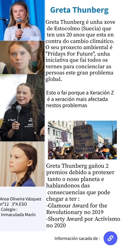 Greta Thunberg é unha xove de Estocolmo (Suecia) que ten uns 20 anos que esta en contra do cambio climático. O seu proxecto ambiental é "Fridays For Future", unha iniciativa que fai todos os vernes para concienciar as persoas este gran problema global.