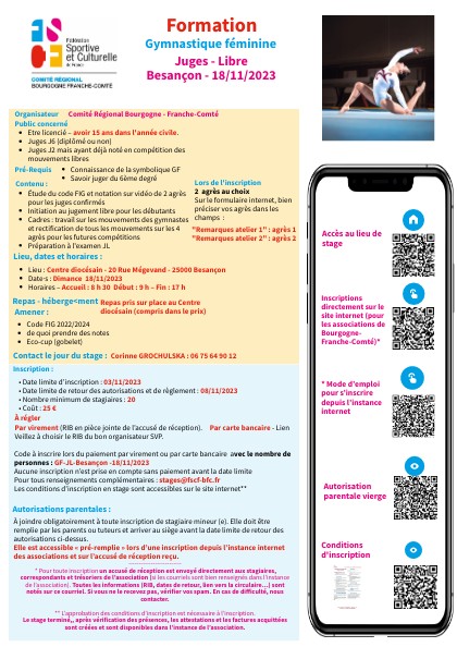 Code à inscrire lors du paiement par virement ou par carte bancaire avec le nombre de personnes : GF-JL-Besançon -18/11/2023 Aucune inscription n’est prise en compte sans paiement avant la date limite Pour tous renseignements complémentaires : stages@fscf-bfc.fr Les conditions d’inscription en stage sont accessibles sur le site internet**