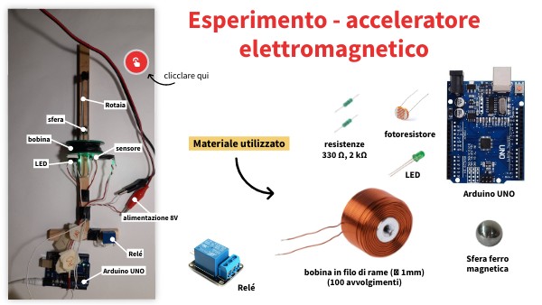 In questo esperimento si è ripordotta una cavità a radio frequenza attraverso una bobina e una biglia ferromagnetica (particella da accelerare). Il sensore fotoluminoso al passaggio della sfera magnetica accende la bobina per 1 decimo di secondo. La biglia è quindi accelerata per un breve tratto e, quando la bobina si disattiva, prosegue sulla rotaia per inerzia.