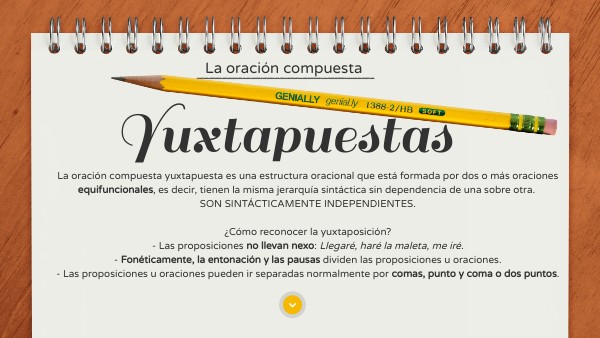 La oración compuesta yuxtapuesta es una estructura oracional que está formada por dos o más oraciones equifuncionales, es decir, tienen la misma jerarquía sintáctica sin dependencia de una sobre otra. SON SINTÁCTICAMENTE INDEPENDIENTES. ¿Cómo reconocer la yuxtaposición? - Las proposiciones no llevan nexo: Llegaré, haré la maleta, me iré. - Fonéticamente, la entonación y las pausas dividen las proposiciones u oraciones. - Las proposiciones u oraciones pueden ir separadas normalmente por comas, punto y coma o dos puntos.