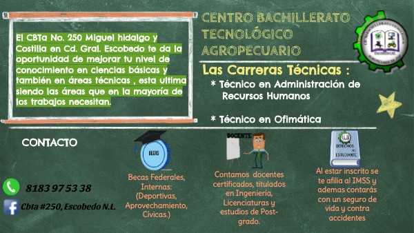 El CBTa No. 250 Miguel hidalgo y Costilla en Cd. Gral. Escobedo te da la oportunidad de mejorar tu nivel de conocimiento en ciencias básicas y también en áreas técnicas , esta ultima siendo las áreas que en la mayoría de los trabajos necesitan.