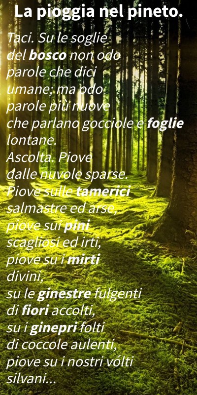 Taci. Su le soglie del bosco non odo parole che dici umane; ma odo parole più nuove che parlano gocciole e foglie lontane. Ascolta. Piove dalle nuvole sparse. Piove sulle tamerici salmastre ed arse, piove sui pini scagliosi ed irti, piove su i mirti divini, su le ginestre fulgenti di fiori accolti, su i ginepri folti di coccole aulenti, piove su i nostri vólti silvani...