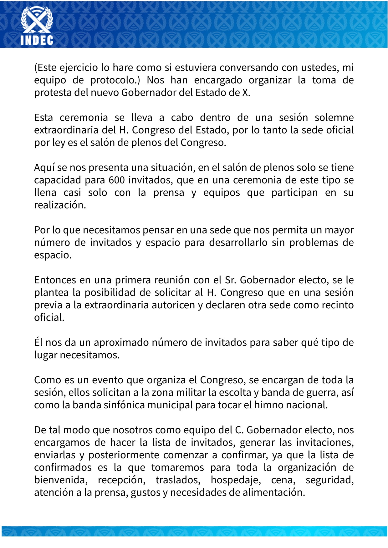(Este ejercicio lo hare como si estuviera conversando con ustedes, mi equipo de protocolo.) Nos han encargado organizar la toma de protesta del nuevo Gobernador del Estado de X. Esta ceremonia se lleva a cabo dentro de una sesión solemne extraordinaria del H. Congreso del Estado, por lo tanto la sede oficial por ley es el salón de plenos del Congreso. Aquí se nos presenta una situación, en el salón de plenos solo se tiene capacidad para 600 invitados, que en una ceremonia de este tipo se llena casi solo con la prensa y equipos que participan en su realización. Por lo que necesitamos pensar en una sede que nos permita un mayor número de invitados y espacio para desarrollarlo sin problemas de espacio. Entonces en una primera reunión con el Sr. Gobernador electo, se le plantea la posibilidad de solicitar al H. Congreso que en una sesión previa a la extraordinaria autoricen y declaren otra sede como recinto oficial. Él nos da un aproximado número de invitados para saber qué tipo de lugar necesitamos. Como es un evento que organiza el Congreso, se encargan de toda la sesión, ellos solicitan a la zona militar la escolta y banda de guerra, así como la banda sinfónica municipal para tocar el himno nacional. De tal modo que nosotros como equipo del C. Gobernador electo, nos encargamos de hacer la lista de invitados, generar las invitaciones, enviarlas y posteriormente comenzar a confirmar, ya que la lista de confirmados es la que tomaremos para toda la organización de bienvenida, recepción, traslados, hospedaje, cena, seguridad, atención a la prensa, gustos y necesidades de alimentación.
