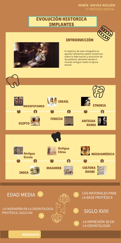 El objetivo de esta infografía es aportar diferentes datos históricos sobre la fabricación y evolución de las prótesis dentales desde el mundo antiguo hasta la época actual.