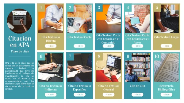 Una cita es la idea que se extrae de un documento de manera textual o parafraseada que sirve de fundamento al trabajo de investigación. La cita se coloca en el texto y es complementada con los elementos que identifican al documento de la cual se extrajo.