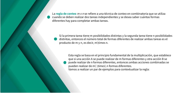 La regla de conteo m x n se refiere a una técnica de conteo en combinatoria que se utiliza cuando se deben realizar dos tareas independientes y se desea saber cuántas formas diferentes hay para completar ambas tareas.
