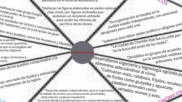 *Desarrollo estados independientes, ques se organizaban al rededor de centros con construcciones piramidales, observatorios y palacios impotentes. *Se asento donde es Guatemala pero con el paso del tiempo se extendio y adoptaron lenguas, tradiciones pero con sus variantes.