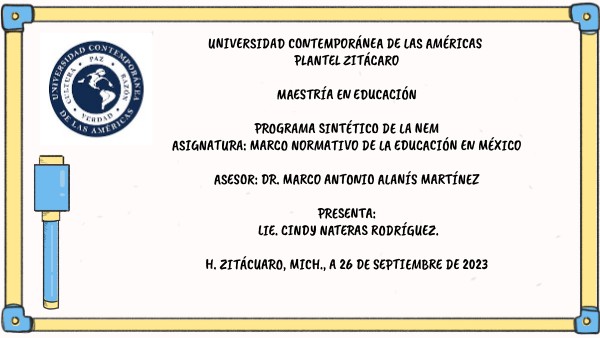 UNIVERSIDAD CONTEMPORÁNEA DE LAS AMÉRICAS PLANTEL ZITÁCARO MAESTRÍA EN EDUCACIÓN PROGRAMA SINTÉTICO DE LA NEM ASIGNATURA: MARCO NORMATIVO DE LA EDUCACIÓN EN MÉXICO ASESOR: DR. MARCO ANTONIO ALANÍS MARTÍNEZ PRESENTA: LIE. CINDY NATERAS RODRÍGUEZ. H. ZITÁCUARO, MICH., A 26 DE SEPTIEMBRE DE 2023