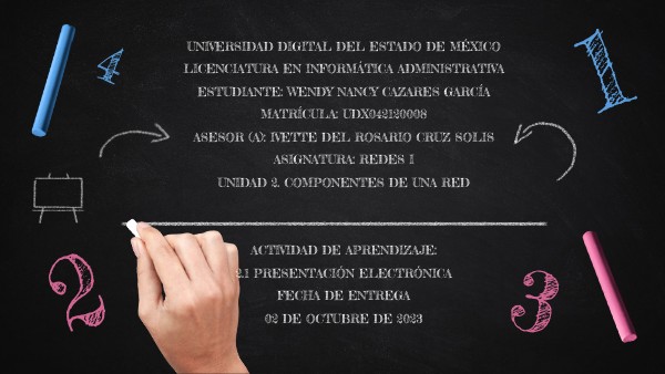 UNIVERSIDAD DIGITAL DEL ESTADO DE MÉXICO LICENCIATURA EN INFORMÁTICA ADMINISTRATIVA ESTUDIANTE: WENDY NANCY CAZARES GARCÍA MATRÍCULA: UDX042120008 ASESOR (A): IVETTE DEL ROSARIO CRUZ SOLIS ASIGNATURA: REDES I UNIDAD 2. COMPONENTES DE UNA RED ACTIVIDAD DE APRENDIZAJE: 2.1 PRESENTACIÓN ELECTRÓNICA FECHA DE ENTREGA 02 DE OCTUBRE DE 2023