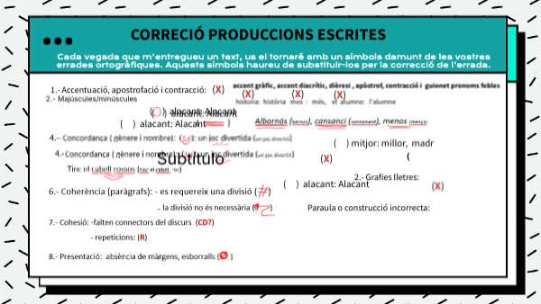Cada vegada que m'entregueu un text, us el tornaré amb un símbols damunt de les vostres errades ortogràfiques. Aquests símbols haureu de substituir-los per la correcció de l'errada.
